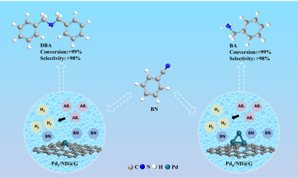 圖4.亞納米尺度下Pd單原子與全暴露Pdn金屬團(tuán)簇活性中心結(jié)構(gòu)與苯甲腈加氫示意圖