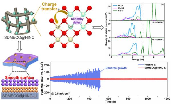 針對不可控鋰離子/原子動力學(xué)行為引起的枝晶生長的問題,藺洪振聯(lián)合西安理工大學(xué)與德國亥姆赫茲電化學(xué)研究所研究人員,從表界面功能化角度出發(fā),首次提出利用高活性電催化劑去調(diào)劑鋰離子動力學(xué)行為,具體而言,采用肖脫基缺陷調(diào)控氧化鈰的4f中心電子結(jié)構(gòu)(SDMECO@HINC),產(chǎn)生大量活性位點(diǎn)提升其催化活性。SDMECO@HINC在Li去溶劑化和Li擴(kuò)散動力學(xué)方面表現(xiàn)出了優(yōu)異的電催化活性,平滑鋰鍍層實(shí)現(xiàn)了無枝晶長壽命的鋰金屬電池。