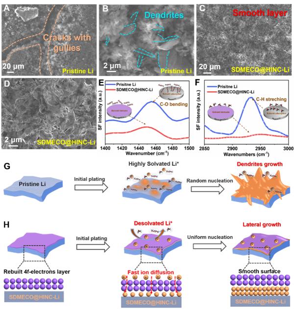 通過SEM觀察到循環(huán)后裸鋰電極表面出現(xiàn)了明顯的裂紋、溝壑和Li枝晶(圖4)。SDMECO@HINC改性后金屬鋰表面均勻光滑且沒有出現(xiàn)明顯的體積變化。研究利用界面敏感的原位和頻率光譜(SFG)進(jìn)一步驗(yàn)證了SDMECO@HINC修飾層的催化去溶劑化作用,有效地促進(jìn)了從溶劑化的Li+中生成自由的Li+,實(shí)現(xiàn)均勻鋰沉積。